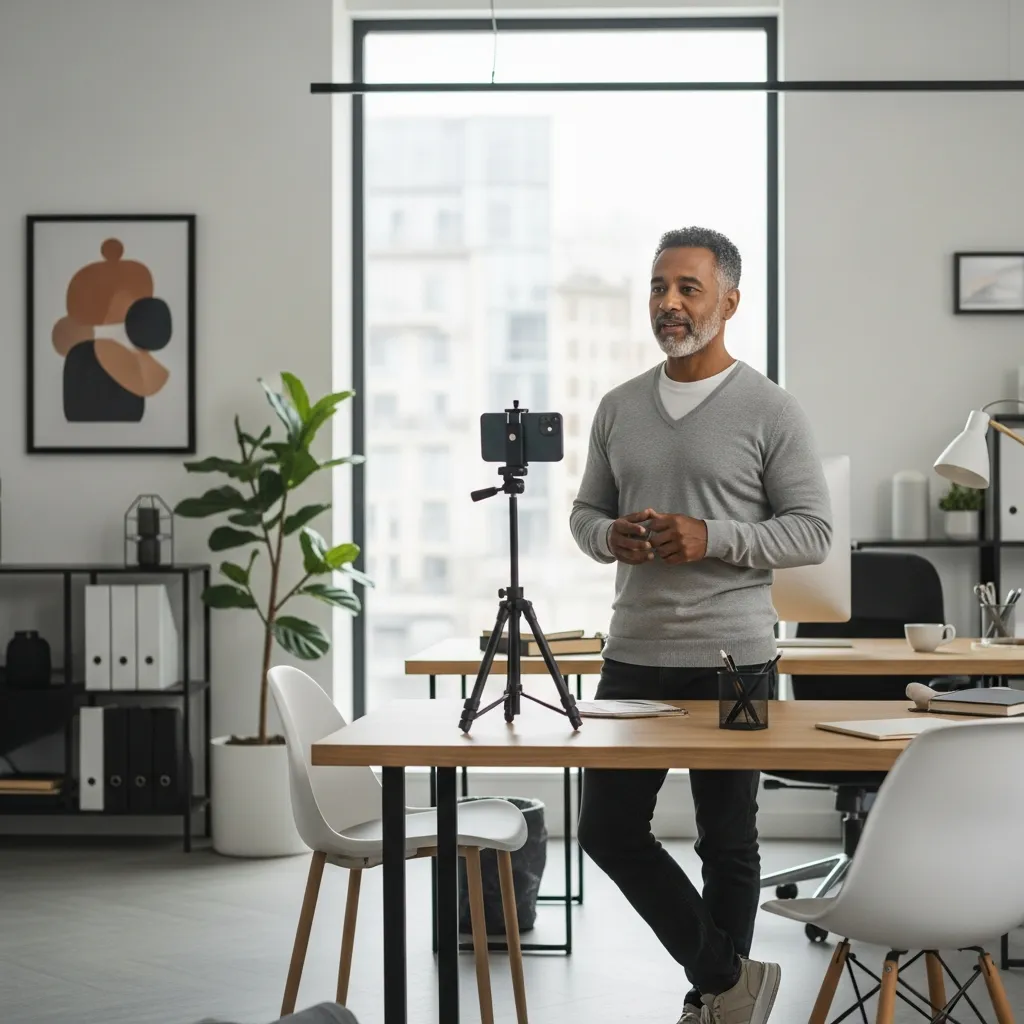 Week 1, Session 1 (60 min): We dial in your tech (camera, sound, lighting), map your ideal client, and co-write your talking-point outline.